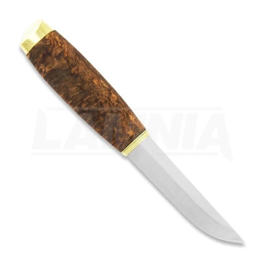 Razor sharp blade comes from Laurin Metalli. Curly birch handle is treated with linseed oil and finished with polished brass bolster. Beautifully decorated, brown leather sheath with plastic insert.