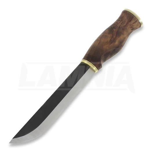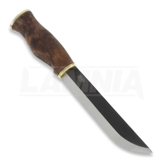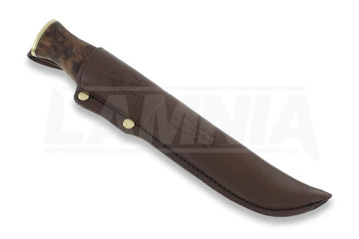 Black spined, razor sharp carbon steel blade comes from Laurin Metalli. Curly birch handle is treated with linseed oil and finished with polished brass bolster. Beautifully decorated, brown leather sheath with plastic insert.