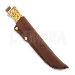Black spined, razor sharp carbon steel blade comes from Laurin Metalli. Curly birch handle is treated with linseed oil and finished with polished brass bolster. Beautifully decorated, leather sheath with plastic insert.