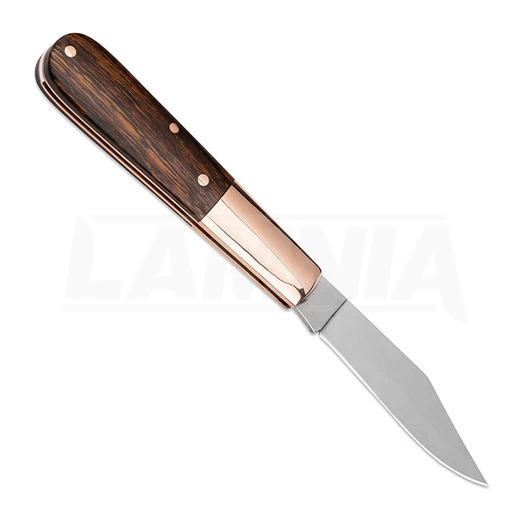 The handy Boker Barlow, with its extra-long bolsters and wide blade, is a true milestone in the model history of the Boker Manufactory. This integral version of the timeless classic is provided with handles made of copper, which are milled from the solid and also form the characteristic bolsters of the Barlow. Thanks to the likewise contoured handle scales made of certified imported desert ironwood, the exceptional gentleman’s knife is extremely comfortable to hold. The slipjoint blade is made of ice-hardened N690 and opened by nail nick. Both the handle and the blade are polished by hand. The compact knife is an absolutely pocket-friendly companion, but is also large enough to handle most everyday cutting tasks with ease. Supplied with a high-quality felt case for storage. Handmade in the Boker Knife Manufactory in Solingen.