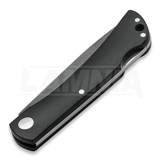 The Rangebuster is a traditional pocket knife that was developed in the USA for use in agriculture as early as the 18th century. The light and comparatively simple knife is reminiscent of the Solingen Hippekniep, but here it is equipped with a reliable backlock. The noble blade of stainless damascus in Basketweave pattern is forged by Rob Thomas, has a flat cut and is opened by means of the traditionally serrated nail nick. Black canvas micarta is used as handle material, the decorative studs are made of stainless steel. Thanks to the contoured handle scales and the slim, lightweight construction, the Boker Rangebuster is extremely comfortable in the hand and thus effortlessly transforms from a working knife to an elegant gentleman’s knife. With practical lanyard hole. Handmade in the Boker Knife Manufactory in Solingen and strictly limited to 275 pieces worldwide. Delivery with certificate of authenticity and individual serial number.