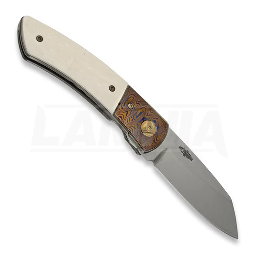 This particular Special Run Edition of the Boker Model 10, by Les Voorhies from Minnesota, is equipped with extraordinary bolsterss made of Damascus-like Mokuti, which is manufactured from two different titanium alloys. The light-coloured handle scales are made of ivory-like Elforyn, the titanium plates underneath are elaborately bronze coloured. The ball-bearing blade is made of powder metallurgical CPM-154, opened with two hands by nail nick and reliably secured by a stable linerlock. Limited to only 20 pieces worldwide. Handmade in the Boker Knife Manufactory Solingen.