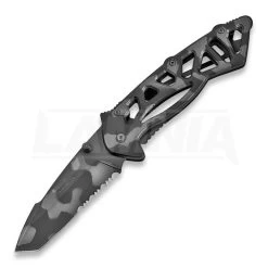 This is a frame-lock knife with smooth and reliable deployment, innovative tactical coatings, and the quality of a Buck knife for an affordable price. The Bones® is a modern and high-tech design, with special attention to ergonomics, including a curved handle with grip points. These grip points are built-in at three critical pressure points to ensure a secure grasp. To keep this knife at its lightest, the skeletal framework minimizes material weight, while maintaining strength. The blade is partially serrated for added performance. The knife features a one-hand ambidextrous open blade deployment with a thumb stud.