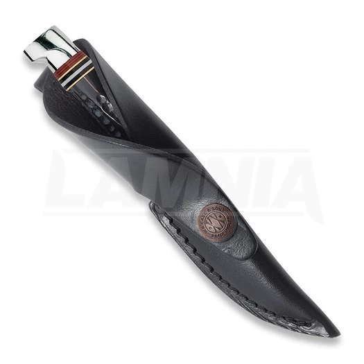 6.25″ overall. 3.13″ mirror finish stainless clip point blade. Buffalo horn handle. Nickel silver guard and pommel. Blade etching. Concave ground blade. Black leather belt sheath.