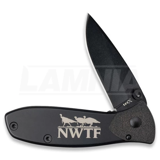 T0102.75B pattern. 70 mm (6.99cm) closed. 44 mm (4.45cm) black finish stainless drop point blade. Black stainless handle. Thumb stud. NWTF logo on handle. Boxed.
