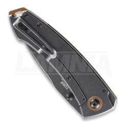 4.5″ overall. Slip joint. Thumb pull. 1.5″ 5Cr15MoV stainless blade with slipjoint opening. Black stonewash finish stainless handle with bronze accents. Finger ring. Carabiner for attachment. Designed by Mike Bond.