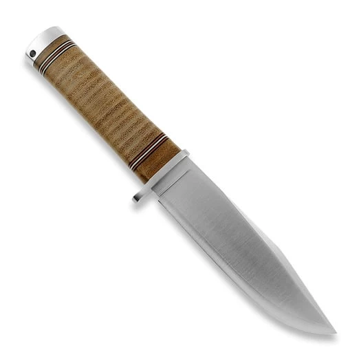 Frey is not merely a beautiful and neat knife – since the blade is in laminated VG10 steel, the knife is relatively strong, and not at all clumsy. The well-made leather handle darkens with age, acquiring a beautiful patina through use