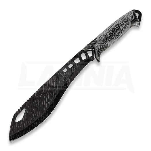 14.5″ overall. 9″ stainless blade. Black and gray rubberized polypropylene handle. Full tang. Lanyard hole. Black acid etched blade. Black nylon multi-mount sheath with push tab release. English packaging.