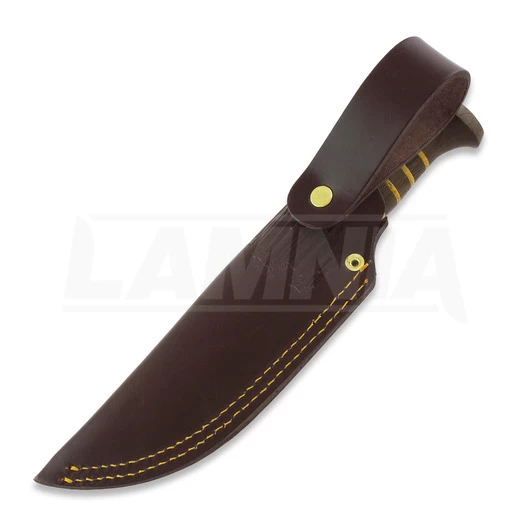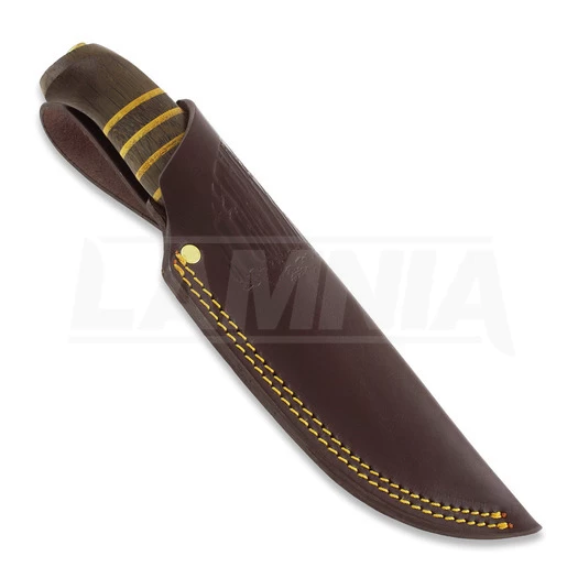 The Morgon knife fits right in the Helle family of classic designs. A beautiful and well-balanced knife well fitted for a day of adventure. With a medium size handle made of a stacked piece of dark oak and yellow dyed leather it will fit most size hands. Fitted on a triple laminated stainless-steel blade. Popping harp right out of the box. A small but distinct finger guard to give you notice where the handle ends and the sharp blade begins.