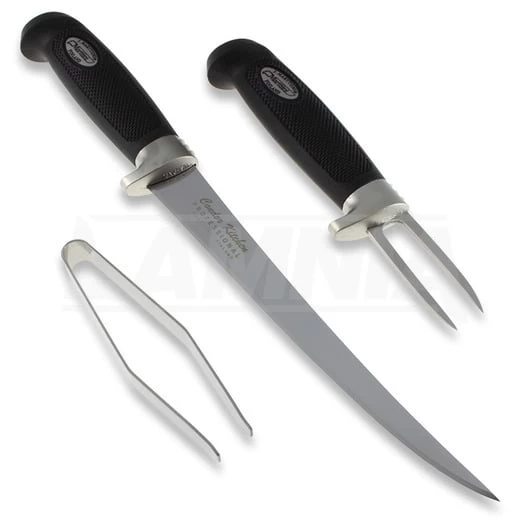 The wooden box contains the Marttiini filleting knife globally famous for its sharpness, and the fish fork to facilitate the work. The set also includes the snappy fishbone pliers.