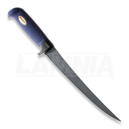 The Martef coating reduces friction almost to none while protecting the blade against corrosion. Cleaning the blade after use is extremely easy. The roughened rubber handle and the finger guard ensure a firm grip of the knife even in difficult conditions. This blade lenght is suitable for the biggest whoppers. The filleting knife comes with a leather sheath.