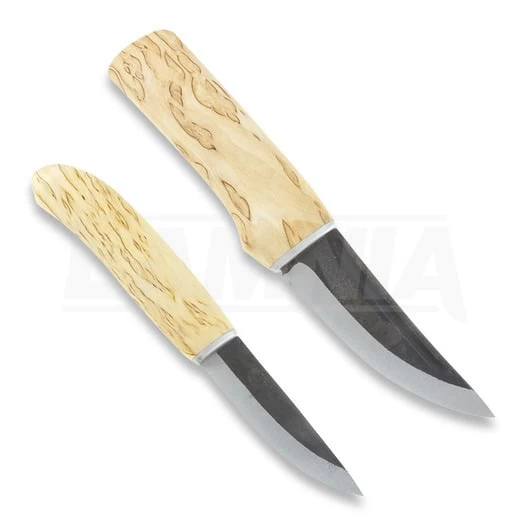 Both Hunting knife and Carpenter knife in a combination sheath. The blades of both knives are made from forged carbon steel and the handles are made from birch with a linseed oil coating that ensures a firm grip even when wet. The special combo sheath is handcrafted from tanned leather.