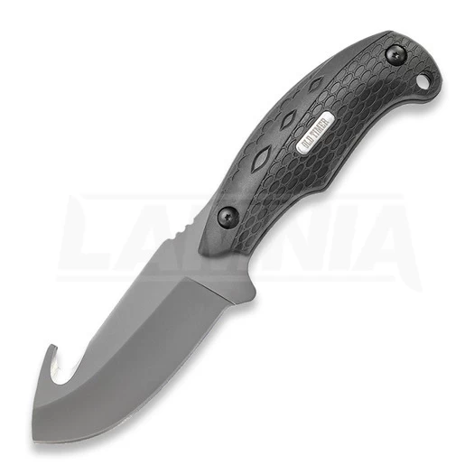 Old Timer. 8″ overall. 3 5/8″ black finish 7Cr17MoV stainless guthook blade. Full tang. Black snake skin textured rubberized onlay handles with Old Timer inlay shield. Lanyard hole. Molded black nylon belt sheath with plastic liner.