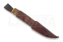 Laurin Metalli 1.4116 stainless steel blade, brass bolsters, moose antler and stabilized curly birch handle. Antique brown leather sheath.
