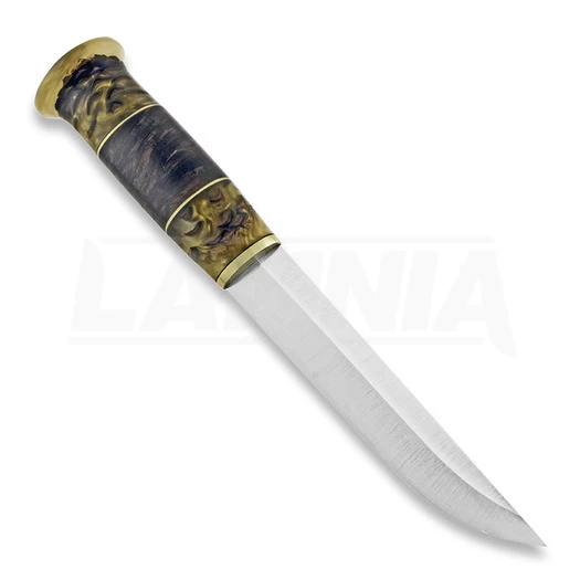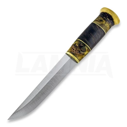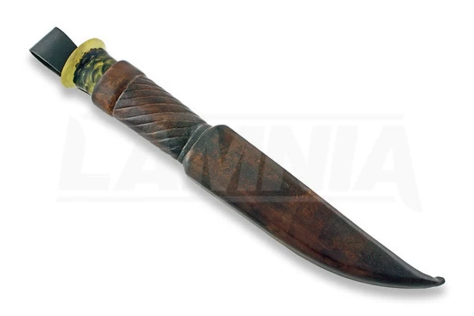 Laurin Metalli 80CrV2 blade, brass, resincast pinecone & stabilized heat treated curly birch