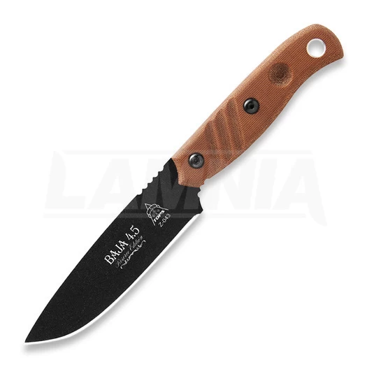 9.25″ (23.5cm) overall. 4.88″ (12.4cm) black traction coated 1095HC steel blade. Tan canvas micarta handle. Full tang. Lanyard hole. Brown leather belt sheath. Designed by Leo Espinoza.