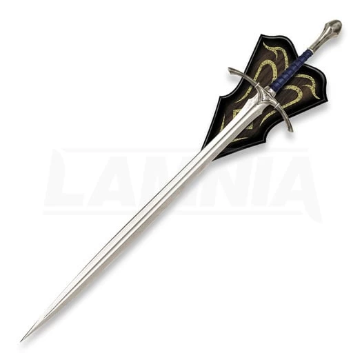 1210 mm overall. 895 mm stainless blade. Authentically detailed replica is a reproduction of the actual filming prop built by Weta Workshop of New Zealand and used in the motion picture, The Hobbit: An Unexpected Journey. Solid metal hilt parts, faux blue jewel inlays, and a genuine leather-wrapped grip. It is presented with a wood wall display and includes a certificate of authenticity.