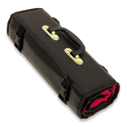 Black PVC construction with red felt interior. Holds approximately 50-60 knives. Black adjustable nylon straps for closing. Black swing handle for carrying. (Knives not included).